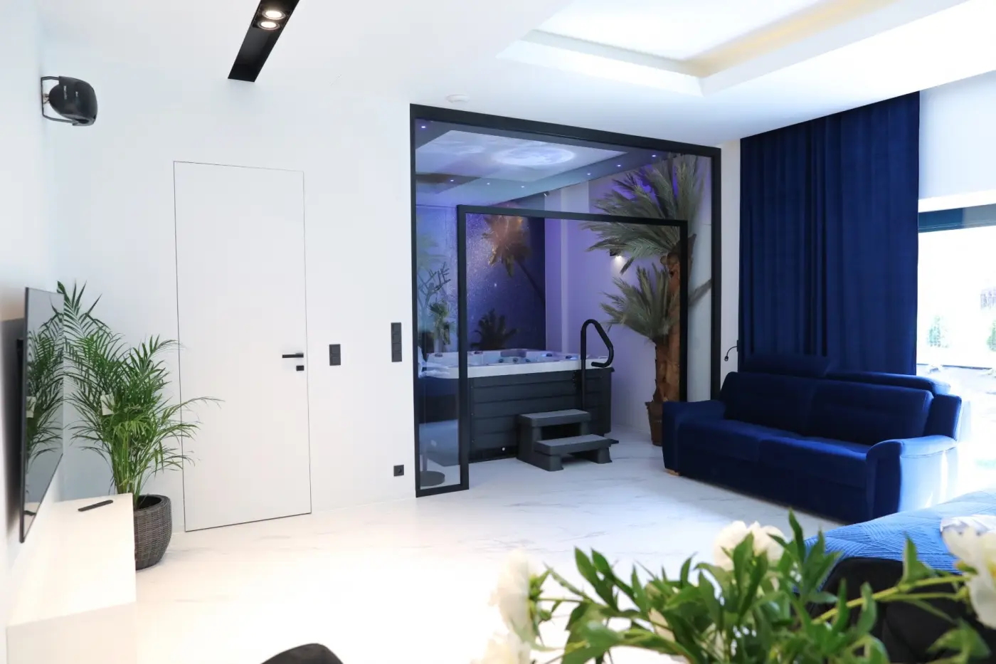 Apartament Księżycowy to nowoczesny apartament o wysokim standardzie. Perełką w naszej ofercie jest stylowe i nowoczesne 4 osobowe jacuzzi otoczone palmami a nad nim gwieździste nocne niebo z księżycem, idealne na romantyczne wypady, randki, zaręczyny, rocznice, urodziny lub po prostu aby odpocząć po całym dniu zwiedzania lub pracy.